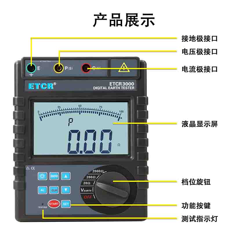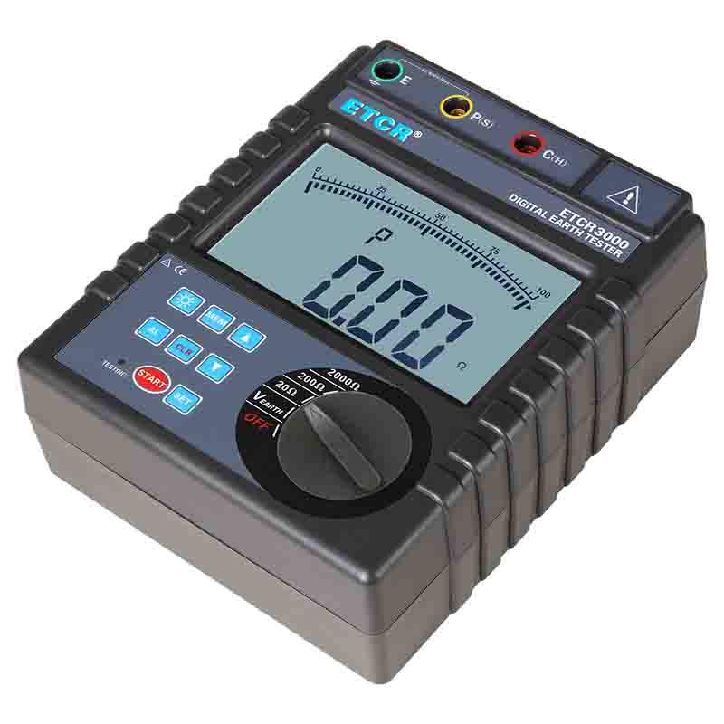 ETCR3000數(shù)字式接地電阻測試儀又稱接地電阻表、數(shù)字接地電阻表、地樁式接地電阻儀、接地?fù)u表,用于接地電阻測量、接地電壓測量,儀表采用數(shù)字及微處理技術(shù),精密3線或簡易2線法測量接地電阻,其廣泛應(yīng)用于電力、電信、氣象、建筑、防雷及工業(yè)電氣設(shè)備等行業(yè)。