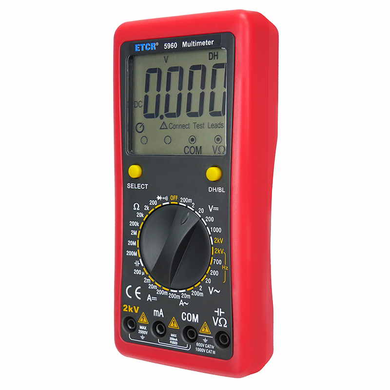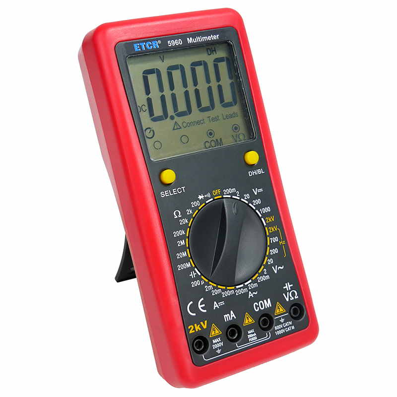 ETCR5960數(shù)字萬(wàn)用表又稱數(shù)字萬(wàn)能表、智能萬(wàn)用表,是一種性能穩(wěn)定、用電池供電的高可靠性數(shù)字萬(wàn)用表,它用單片機(jī)管理,全功能有過(guò)載保護(hù)。儀表能顯示各檔表筆和插座應(yīng)插的位置,提示您不要插錯(cuò)位置。該儀表能測(cè)量直流電壓和電流、交流真有效值電壓和電流、電阻、電容、二極管正向壓降、電路通斷等。測(cè)量準(zhǔn)確、性能穩(wěn)定、安全可靠,是您理想的測(cè)試維修工具!