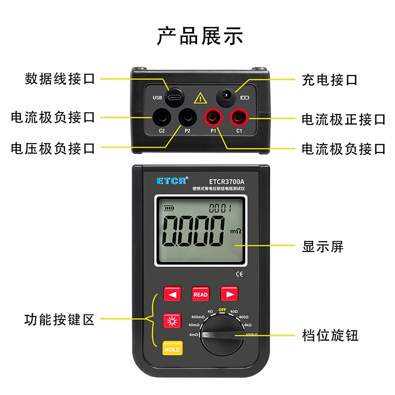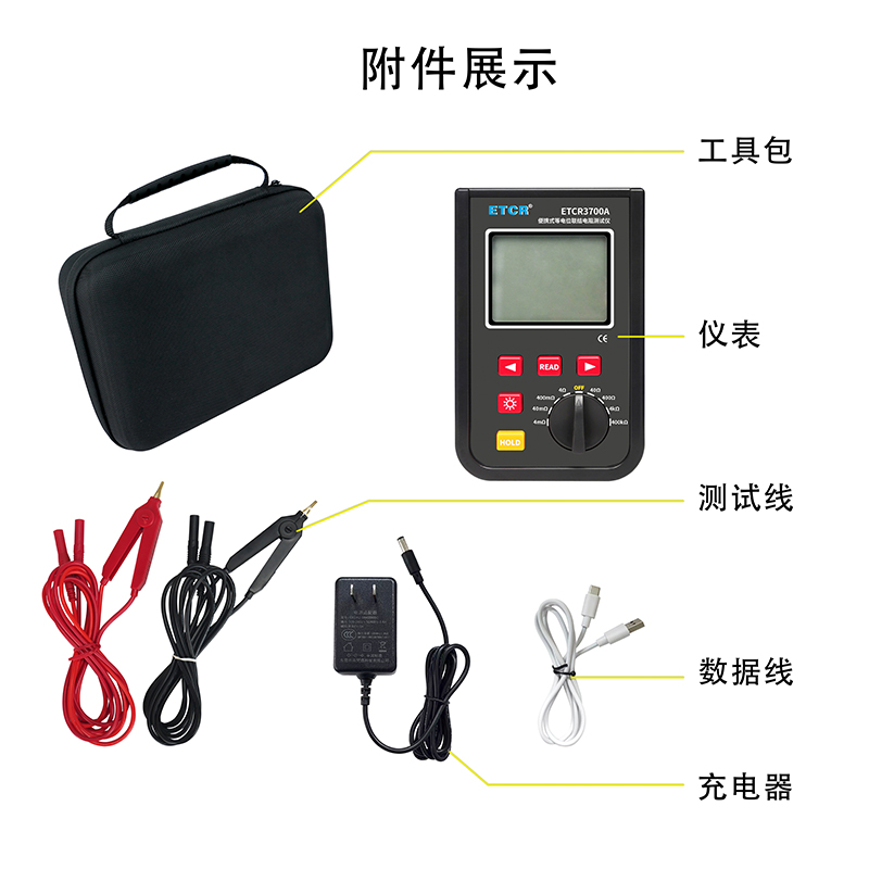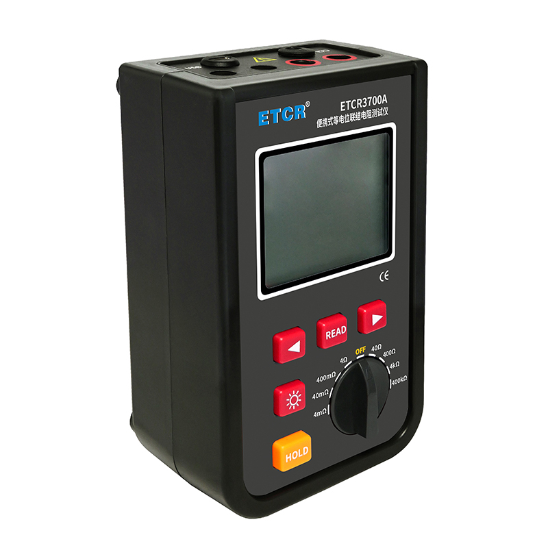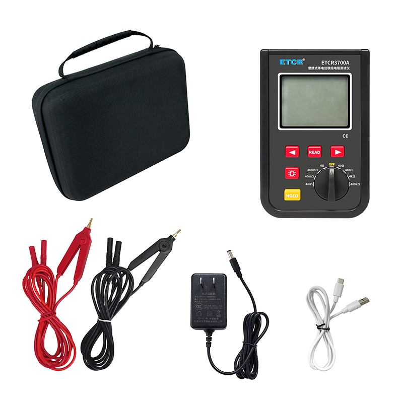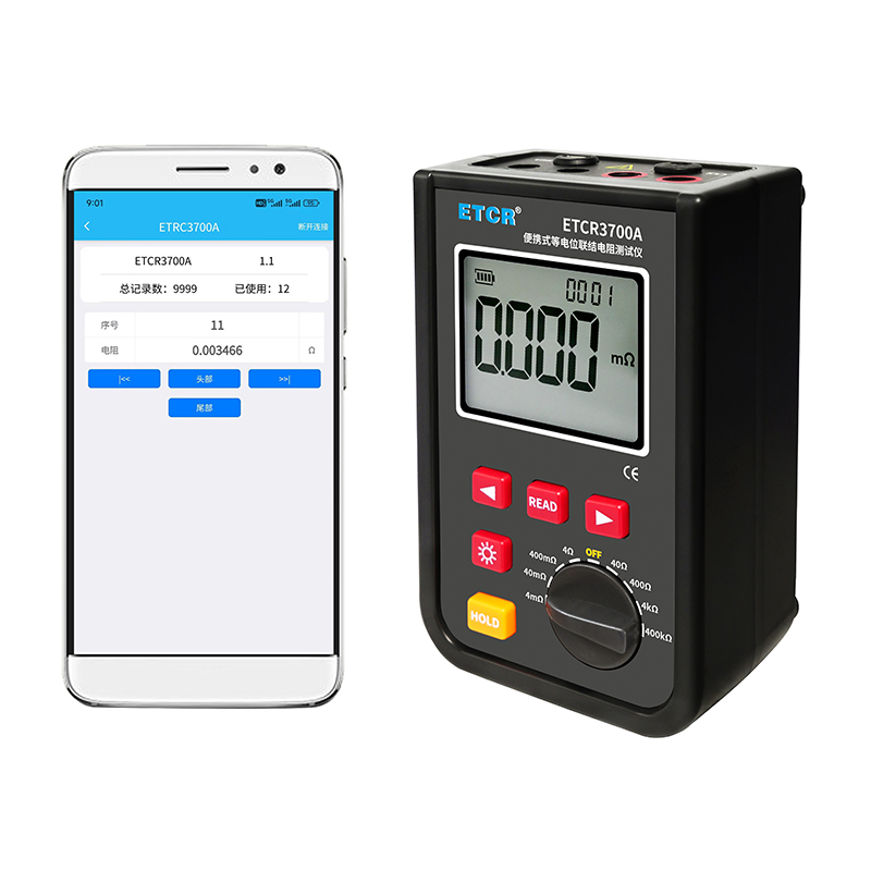 ETCR3700A等電位聯接電阻測試儀由主機、測試線組成。寬量程:0.001mΩ~400kΩ,高分辨率1uΩ,最大測試電流:1.2A,主機大屏LCD顯示,采用可充電大容量鋰電池,儀表具有自動關機功能,數據存儲功能,存儲測試數據9999組,具有藍牙通訊,安裝APP后可在手機查看測試記錄,具有USB接口,安裝上位機軟件后,可將測試數據下載電腦進行保存、管理、查詢、分析、打印等,儀表操作簡易,攜帶方便。