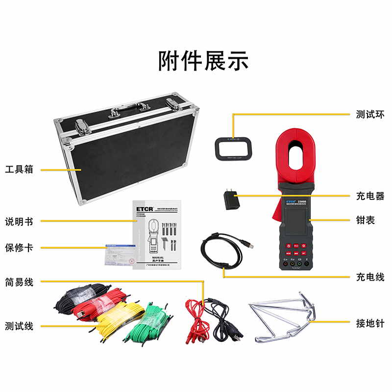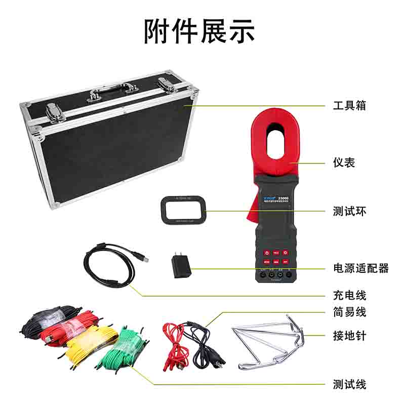 | 測試線 | 測試線:紅色20m,黑色20m,黃色10m,綠色10m各1條;簡易測試線:紅色1.6m,黑色1.6m各1條 |