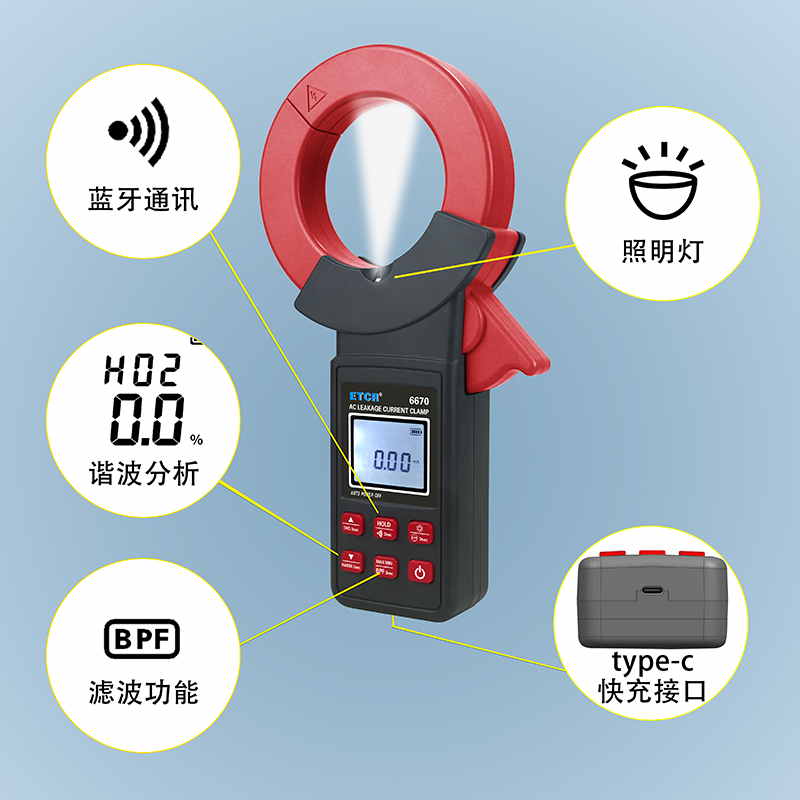 ETCR6670鉗形漏電流表可測試40Hz~1kHz頻率范圍的電流。鉗表還具有背光、手電筒、數據存儲、藍牙通訊等功能。鉗表使用大容量鋰電池type-c充電口,是一款新型的電工安全檢測必備工具。