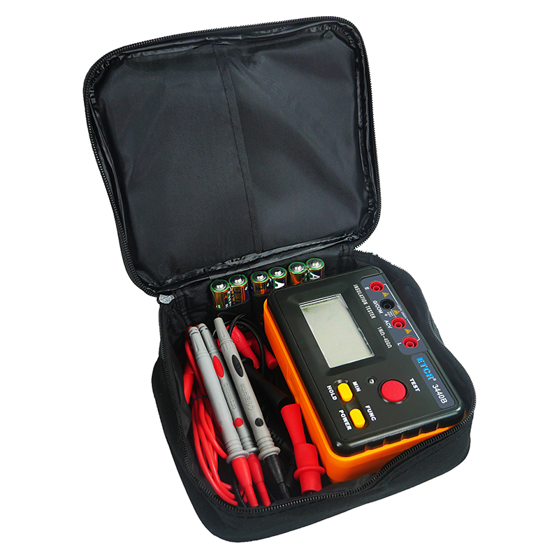 ETCR3440A絕緣電阻表是一款數字式絕緣電阻測試儀。其準確度高、操作簡單可靠、使用方便。根據不同機型,輸出測試電壓500V/1000V/2500V可切換。普通絕緣電阻表不能測量自身輸出的高壓,在絕緣電阻表輸出高壓不符合額定值時,用戶不容易發現,以至有時測量結果偏差過大,造成安全隱患,它可適時監測輸出高壓,用戶在任何時候都能觀察到儀表實際輸出的測量電壓,有效避免因輸出電壓不符合額定值要求而造成的誤判。儀表測量范圍最高可達到40GΩ,可根據需要設置測量時間,測量完畢后或在測量中按任一按鍵都會自動保持測量結果。本產品適用于測量變壓器、電機、電纜、開關、電器等各種電氣設備及絕緣材料的絕緣電阻,對各種電氣設備進行保養維修、試驗及檢定。它結構精巧,攜帶方便,是您理想的電工、電子測試儀表。