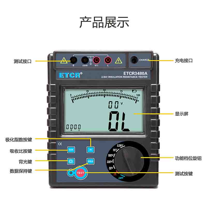 ETCR3480A絕緣電阻表整機美觀,量程寬,精度高,分辨率高,操作便捷,攜帶方便,準確可靠、性能穩定,抗干擾能力強。而且具有防震、防塵、防潮結構,適用于電機、開關、電器等各種電器設備及絕緣材料的絕緣電阻測量。是電信、電力、氣象、機房、油田、機電安裝和維修以及利用電力作為工業動力或能源的工業企業部門常用而必不可少的儀表。