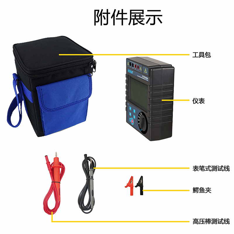 1、5檔輸出電壓50V、250V、500V、1000V、2500V,寬量程0.1MΩ~200GΩ,最大短路電流2mA。