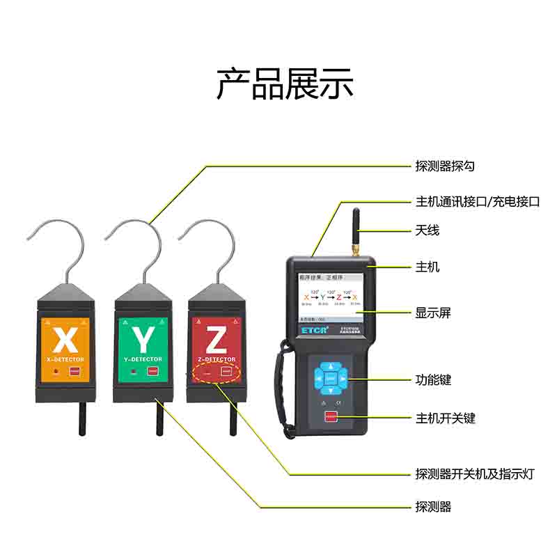 ETCR1050無線高壓相序測試儀由主機、3個探測器、伸縮絕緣桿、數據上傳軟件、USB通訊線等組成,主機采用3.5寸真彩液晶屏,可以同屏顯示相位、頻率、相序及核相結果,向量圖指示、相位指示清晰直觀,具有“X信號正常、Y信號正常、Z信號正常、正相序、反相序、同相、異相”等語音提示功能,使測試更簡單輕松。儀表有USB通信接口,存儲數據可上傳電腦進行歷史數據讀取、查閱、保存、打印。