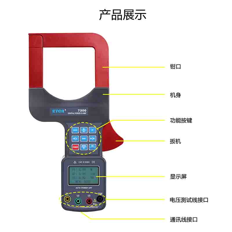 ETCR7300大口徑三相鉗形功率表又名鉗形功率計、超大口徑鉗形功率表、三相鉗形功率表,用于現場測量三相交流電壓、電流、漏電流、電壓間相位、電壓電流間相位、頻率、相序、電能、有功功率、無功功率、視在功率、功率因數、總功率等電能參數。還能用于判別變壓器接線組別、感性、容性電路,讀出差動保護各組CT之間的相位關系,檢查電度表的接線正確與否,檢修線路設備等,為用電檢查人員提供一種安全、準確、便捷的新型電力儀表。