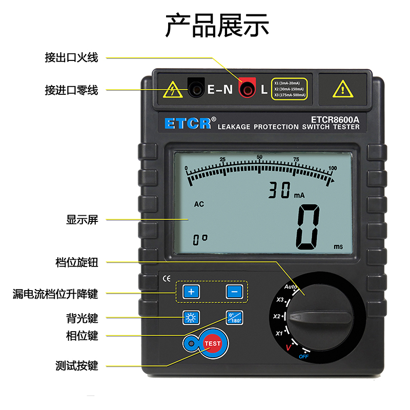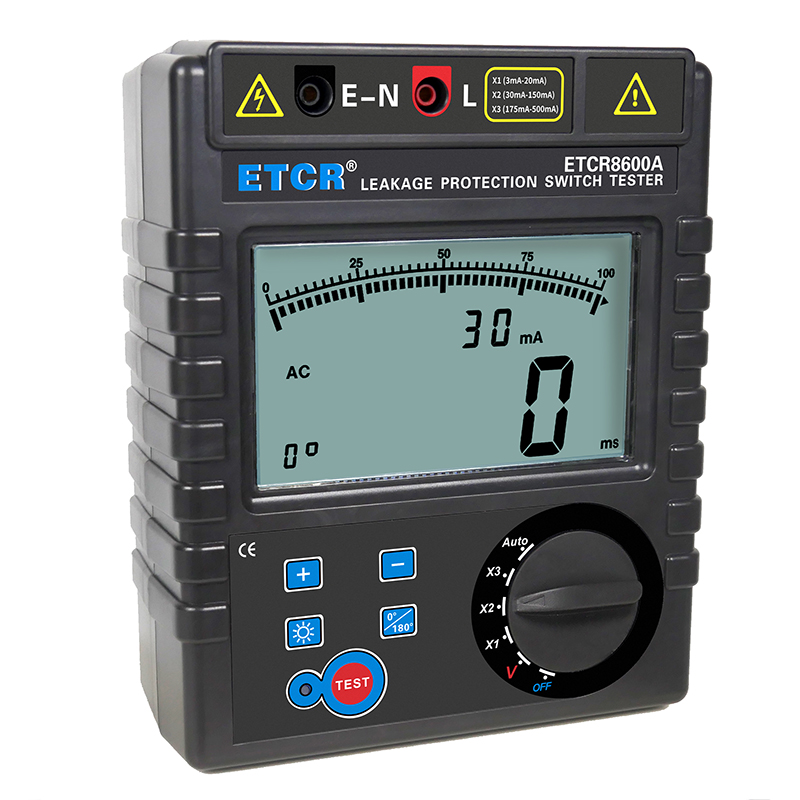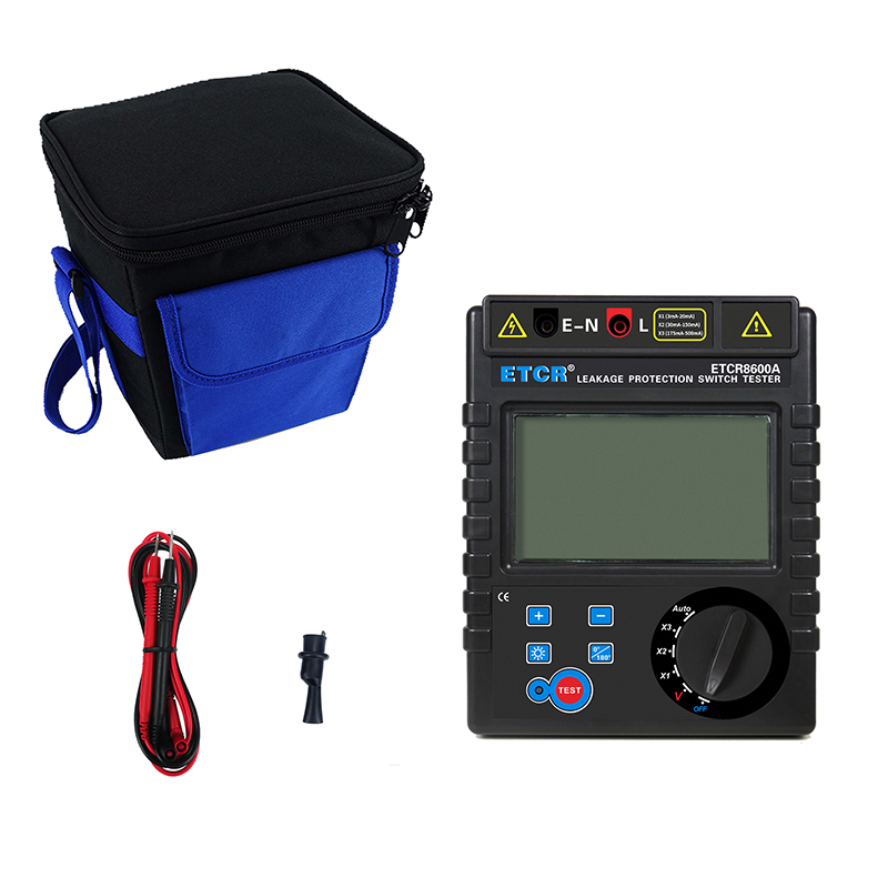 | ETCR8600A漏電保護器測試儀 | 3mA~500mA,十八檔 | 0ms~999ms | AC 0~600V | 大LCD屏 | 干電池 |