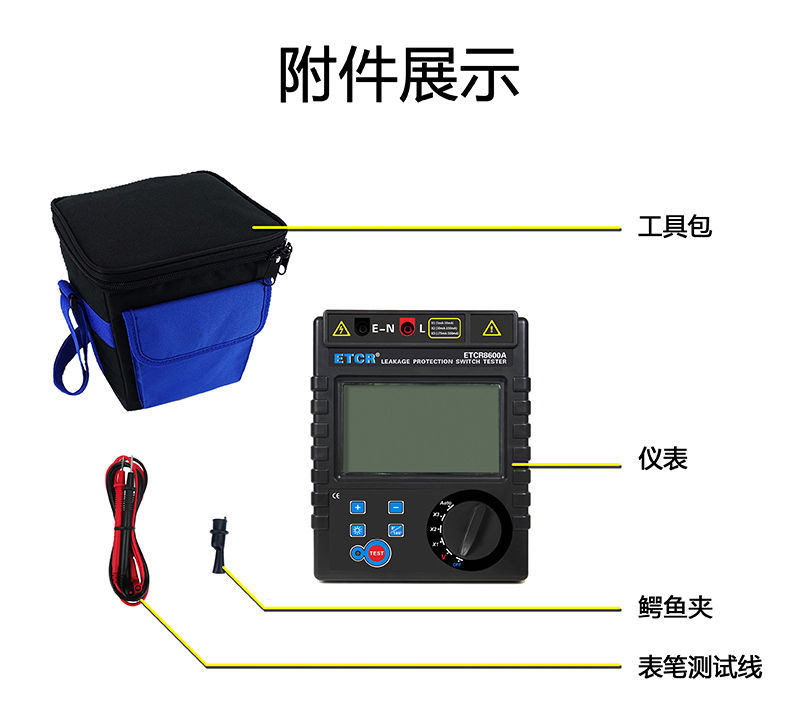 | ETCR8600B漏電保護器測試儀 | 5mA~1000mA,十六檔 | 0ms~999ms | AC 0~600V | 觸摸彩屏 | 鋰電池 |