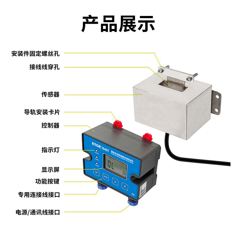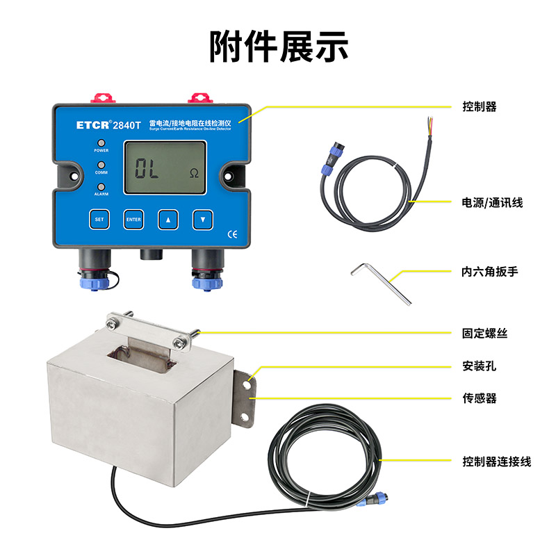 ETCR2840T雷擊電流/接地電阻在線監測儀由控制器、傳感器、安裝五金件組成。ETCR2700T為分體式結構,傳感器與控制器分為兩部分,傳感器殼體采用不銹鋼制作,堅固耐用以適應不同的應用環境。
