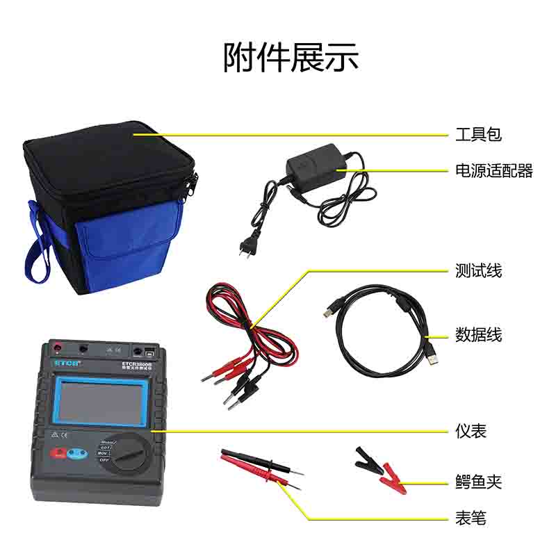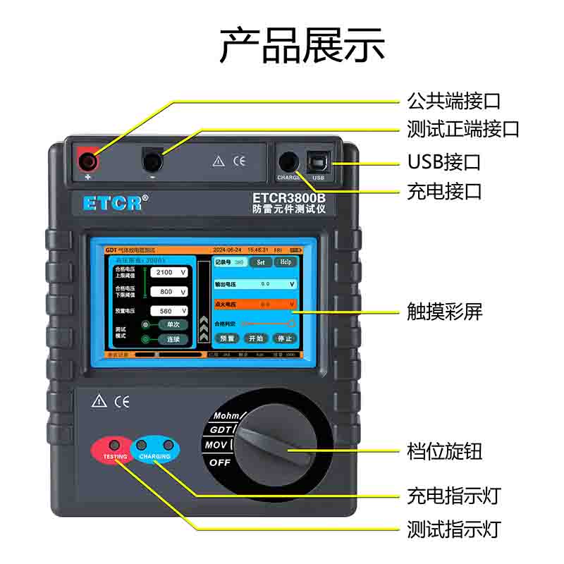 ETCR3800B智能型防雷元件測試儀采用觸摸彩屏中文界面,功能直達、一鍵測量、操作簡易快捷,用戶無需費力記憶操作方法,點擊屏幕的“HELP”即可彈出操作方法,有效指引用戶操作儀表。同時儀表采用大容量可充電鋰電池、具有數據存儲功能,可自動存儲含有日期時間的測試結果3000組、觸摸屏方便用戶查閱歷史記錄、USB數據上傳導出等功能,還有自動關機、電池電量低提醒等功能。
