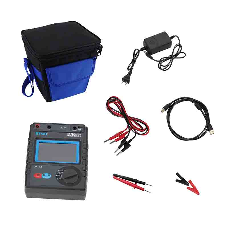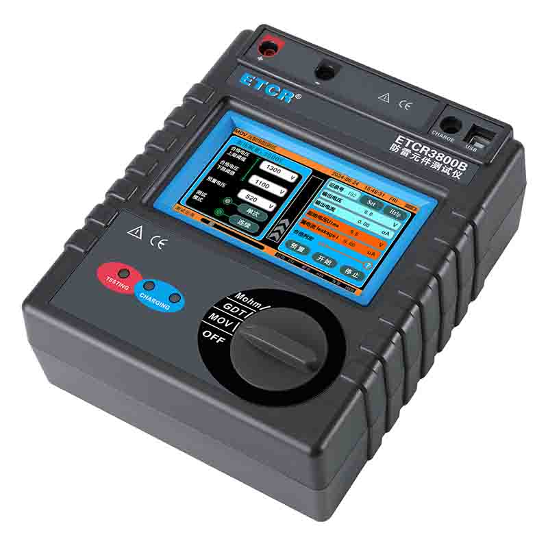 ETCR3800B智能型防雷元件測試儀又稱防雷元件測試表、SPD現場測試儀、壓敏電阻測試儀、浪涌保護器測試儀,用于測量各種壓敏電阻(MOV)、氣體放電管(GDT)、浪涌保護器(SPD)性能參數測試,還具有絕緣電阻、吸收比、極化指數測試功能。儀表具有獨特的高壓短路保護、過流保護功能,專業級的參數設置功能、高壓限值設定、升壓速度設定、合格范圍設定、合格判斷篩選、自動量程調節等功能。還具有單件測試模式、連續測試模式功能,特別適合批量元件測試。儀器廣泛用于避雷器、防雷器、浪涌保護器、壓敏電阻、金屬陶瓷放電管、真空避雷管等過壓防護元件性能參數的測試。是氣象防雷、電力、通信、機電安裝和維修、防雷元件生產廠家、以及工業企業部門常用必備的儀表。