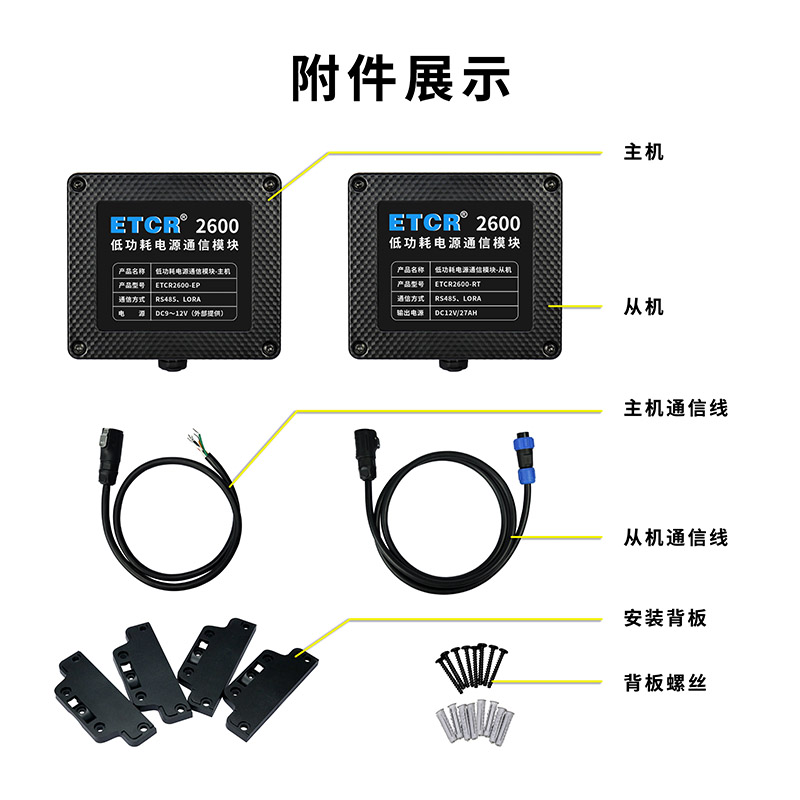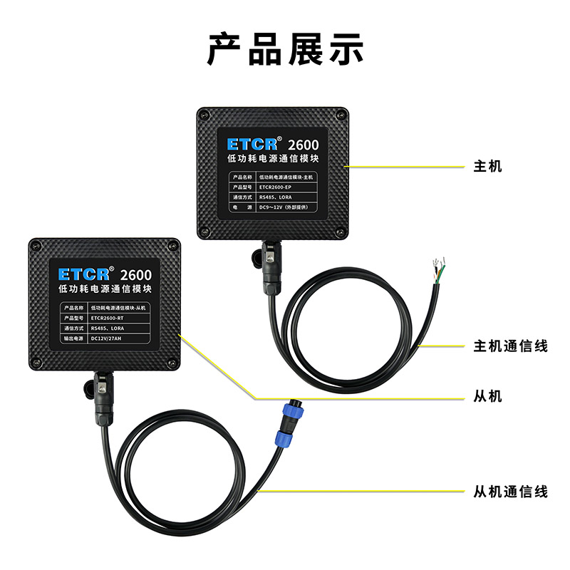 ETCR2600低功耗電源通信模塊由主機、從機、通信線組成,主機與從機間通過LORA通信組建網絡,主機集中接收現場各個從機的數據,通過RS485通信將數據包主動上報,實現對現場設備的遠程在線監測。從機通過RS485采集檢測儀數據同時為檢測儀提供電源,解決現場難以供電的問題,一個主機可同時與1~200個從機通信。