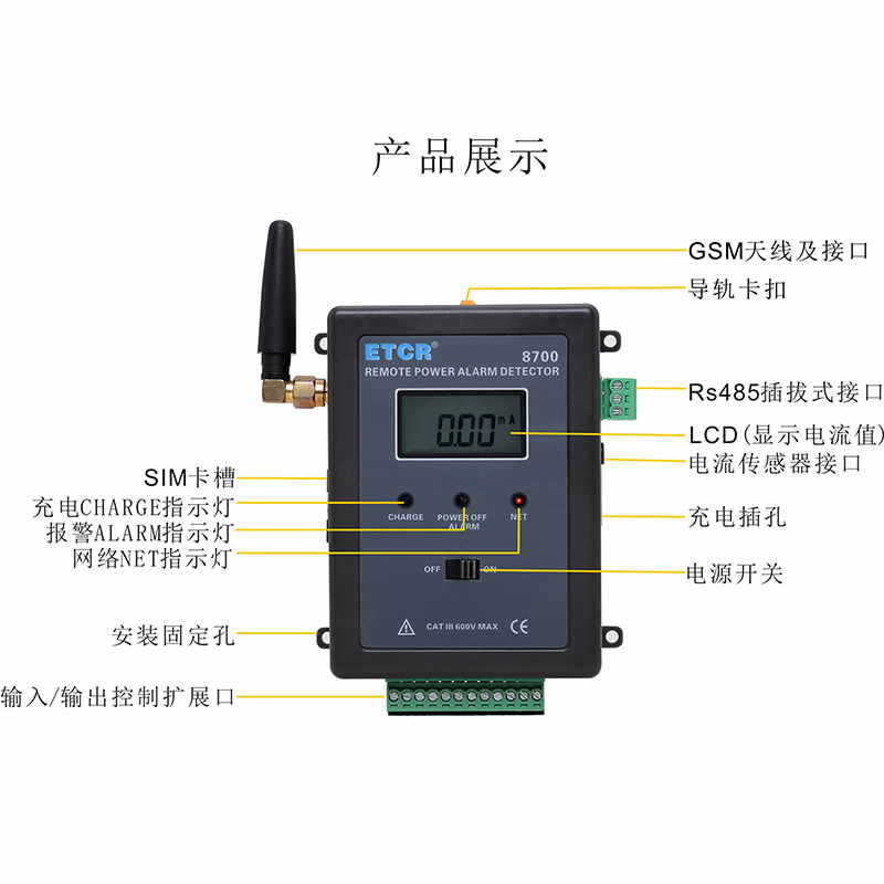 ETCR 8700遠(yuǎn)程斷電/漏電報(bào)警監(jiān)測(cè)儀又稱在線斷電報(bào)警器,用于需要無(wú)人值守和遠(yuǎn)程在線報(bào)警監(jiān)測(cè)斷電、恢復(fù)供電、漏電的工控現(xiàn)場(chǎng),屬工業(yè)級(jí)4G報(bào)警監(jiān)控儀,也可以當(dāng)防盜報(bào)警器使用。監(jiān)測(cè)儀由電腦、電流傳感器、GPRS模塊、上位機(jī)軟件、電源適配器等組成。內(nèi)置GPRS模塊,用戶只需通過自己電腦服務(wù)器設(shè)置幾個(gè)簡(jiǎn)單參數(shù),就可以隨時(shí)監(jiān)測(cè)遠(yuǎn)程設(shè)備是否斷電、是否恢復(fù)供電、是否有漏電等報(bào)警信息;也可以通過輸入擴(kuò)展口接入溫度、濕度、人體紅外感應(yīng)器等傳感器;還可以通過輸出擴(kuò)展口控制遠(yuǎn)程的繼電器等其他設(shè)備。廣泛適用于安防、電力設(shè)備、銀行、電信、工廠、鐵路、機(jī)房、不間斷電源、生物制藥、倉(cāng)庫(kù)、藥房、重要機(jī)械設(shè)備、24小時(shí)運(yùn)轉(zhuǎn)的生產(chǎn)線等各種需要斷電報(bào)警、漏電監(jiān)測(cè)報(bào)警、遠(yuǎn)程控制啟停等場(chǎng)所。