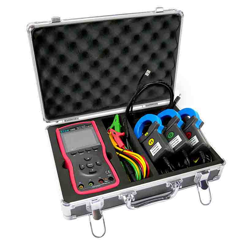ETCR4320大口徑三相數字相位伏安表又稱三鉗相位伏安表、三相相位伏安測試儀、手持式相位測試儀、便攜式相位表 、矢量圖分析儀,用于同時測量三相交流電壓、電流、電壓間相位、電流間相位、電壓電流間相位、頻率、相序、有功功率、無功功率、視在功率、功率因數、電流矢量和,判別變壓器接線組別、感性、容性電路,測試二次回路和母差保護系統,讀出差動保護各組CT之間的相位關系,檢查電度表的接線正確與否,檢修線路設備等,為用電檢查人員提供一種安全、準確、便捷的新型電力儀表。尤其適用于電能計費系統及繼電保護系統。