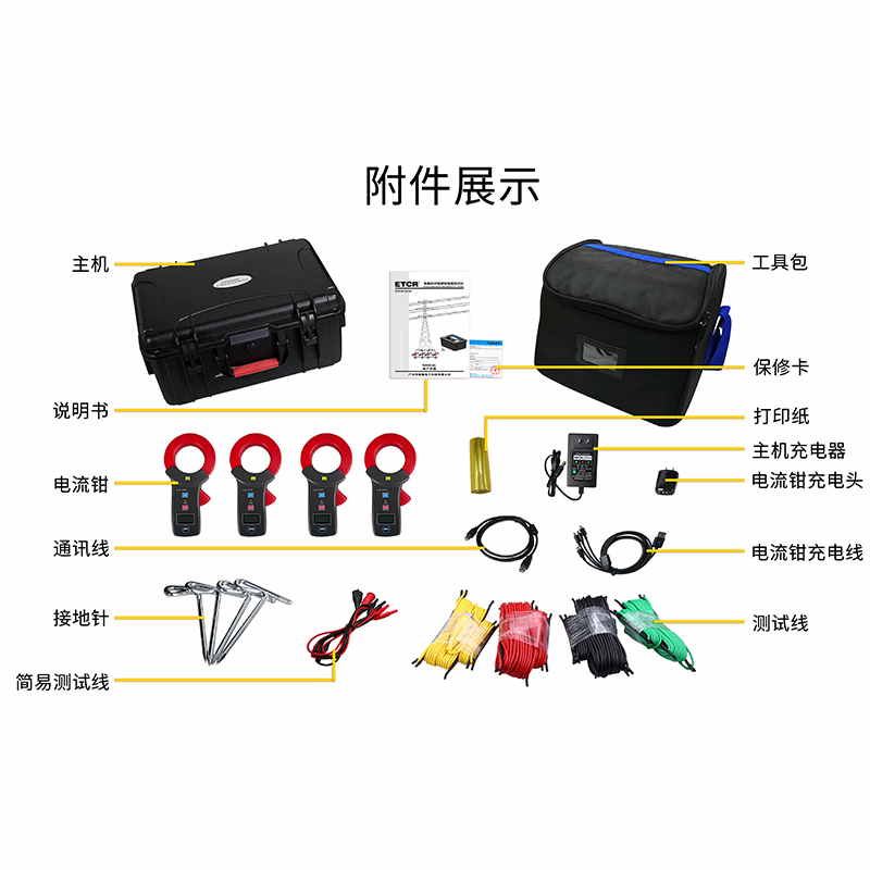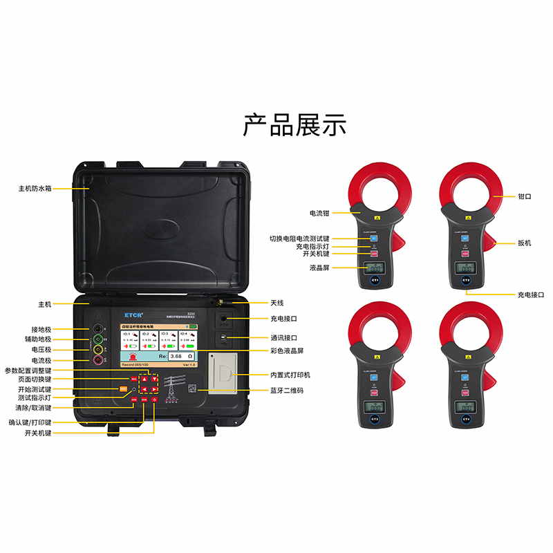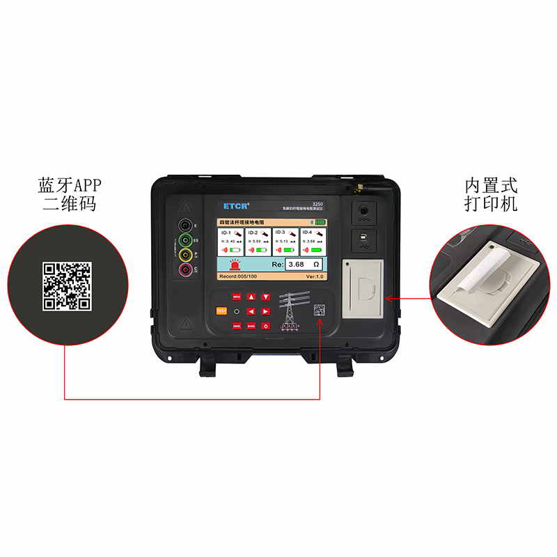ETCR3250免解扣桿塔接地電阻測試儀由主機、4個電流鉗、測試線、輔助接地棒、通訊線、打印機等組成。主機采用7寸彩屏,電流鉗與主機采用無線通訊,儀表還具有藍牙通訊,下載APP后可在手機進行測試及查看測試結果。儀表配有內置式打印機,可在現場打印測試結果。儀表能存儲100組數據,通過USB接口及上位機軟件上傳測試結果,實現歷史數據讀取、查閱、保存、報表、打印等功能。儀表外殼采用防水保護箱,防撞、防摔、防水(防護等級IP65)堅固安全耐用,儀表還配有大容量可充電鋰電池組,特別適合在戶外工地使用。