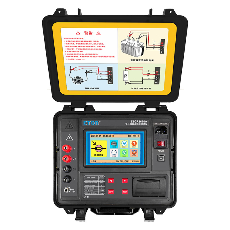 ETCR3670A變壓器直流電阻測(cè)試儀由主機(jī)、測(cè)試線、USB通訊線等組成,儀表采用微處理機(jī)技術(shù),精密四線法測(cè)試,量程寬0.100mΩ~50.00kΩ,精度高0.2%,最高分辨率1uΩ,測(cè)量準(zhǔn)確可靠。儀表具有自動(dòng)測(cè)量及手動(dòng)測(cè)量?jī)煞N測(cè)量模式,采用快速自動(dòng)消磁技術(shù),用戶無需在測(cè)試后另行消磁。儀表具有75℃溫度折算電阻計(jì)算功能,根據(jù)試品的溫度、材質(zhì)進(jìn)行補(bǔ)償折算。儀表采用5寸全彩高清觸摸屏,帶背光調(diào)節(jié)功能,強(qiáng)光下清晰可見。儀表帶有內(nèi)置打印機(jī)、藍(lán)牙通訊,USB接口。儀表還有自動(dòng)放電功能,告警功能、時(shí)鐘功能等。是快速測(cè)量變壓器繞組直流電阻的理想儀表。
