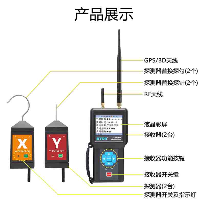 ETCR1500A遠程高壓核相儀又稱衛星授時高壓核相儀,同時具備超遠距離核相和普通近距離核相功能,采用衛星精準授時技術,實現遠距離核相、近距離普通核相、地下室核相、礦井下核相,授時精度小于20nS,實現聯合授時,確保核相精準。普通核相距離200m(在空曠場所),衛星核相距離5000m。本核相儀既可以在高壓線路,也可以在高壓開關柜(中置柜、環網柜等)進行核相,實現從10V~500kV電壓等級自動核相、相位測試、頻率測試、相序判斷、驗電及電壓等級顯示等功能。當線路電壓超過110kV,必須使用非接觸核相,核相時將探測器的金屬探鉤逐漸靠近導線,當感應到電場信號即可完成核相,無需直接接觸高壓導線,安全快速。用于環網柜核相時,探測器必須使用探針及環網柜測試線。