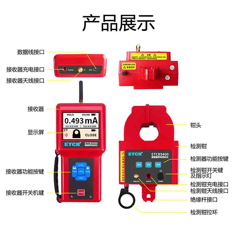 ETCR9400氧化鋅避雷器鉗形帶電測試儀由主機、檢測儀、絕緣桿組成。主機與檢測儀采用無線通訊,通訊距離30米,主機可遙控檢測儀鉗頭的張開或閉合完成測試過程,主機能實時顯示電流測試值及鉗頭狀況。檢測儀采用微型馬達驅(qū)動鉗頭的張開或閉合,鉗頭采用高性能坡莫合金制作,具有超強的抗干擾能力,幾乎不受外部磁場的影響,分辨率高達1uA。檢測儀可連接絕緣桿用于高壓線路的氧化鋅避雷器測試。儀表也可做超高精度鉗形漏電流表使用。儀表還具有數(shù)據(jù)保持、數(shù)據(jù)存儲功能,配有USB接口,存儲數(shù)據(jù)可上傳電腦。