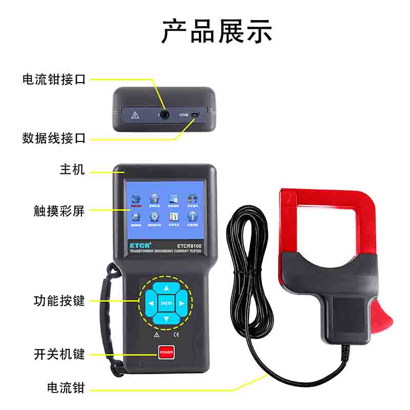| ETCR8100B變壓器鐵芯接地電流測試儀 | AC 0.00mA~100A | 10Hz~1000Hz | 80mm×80mm | 可設置報警閾值 | 100組 |